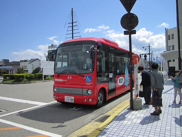 以前(2012年春)に利用した際には、(ハイエース的な)ワンボックスカーの運転席横に料金箱を据え付けたような、やっつけ感満載のバスでしたが、今回利用した際には、丸っこいボディのコミュニティーバスが使用されてました(車内にはまだ新しい匂いが漂ってました)。車体側面に地元のゆるキャラ「ミラたん」のイラストが描かれており、車体の丸っこさと相まってかなりかわいい雰囲気です。
