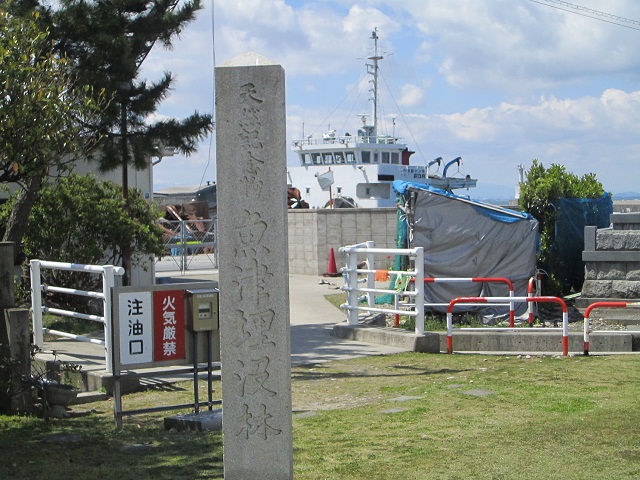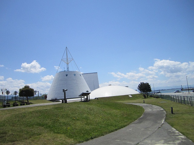東舞鶴駅から徒歩15分ほど歩いたところにあり、道路一つ挟んで東舞鶴の港に面しています。こちら側からは自衛隊の艦船は見えませんが、新日本フェリーの大きな船を眺めることができます。