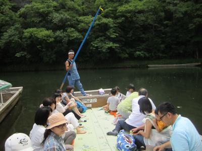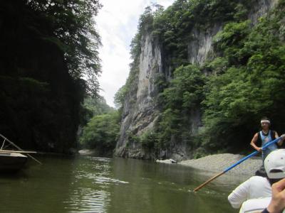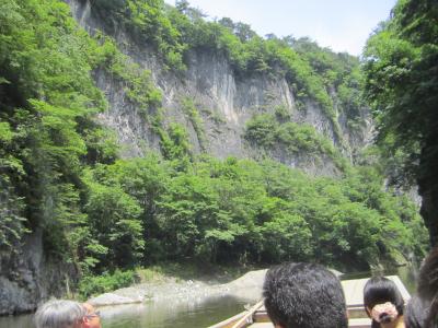 名勝猊鼻渓(を流れる砂鉄川)を底の平らな船で遊覧する観光船です。船頭さん一人で40~60人乗りの船を操り、川の上流へ向かって、猊鼻渓の名前の由来にもなった「獅子の鼻」付近で上陸、獅子の鼻の眺めを楽しんだ後、猊鼻追分という独特の節回しの舟歌を聴きながら、川を下ってくるという、90分のコースです。川の流れは基本的にとても静かなので船酔いの心配はほぼないと思います。船に乗っている間は飲み物などは買えませんから、暑い時期にはあらかじめ飲み物を持参していくことをお奨めします。