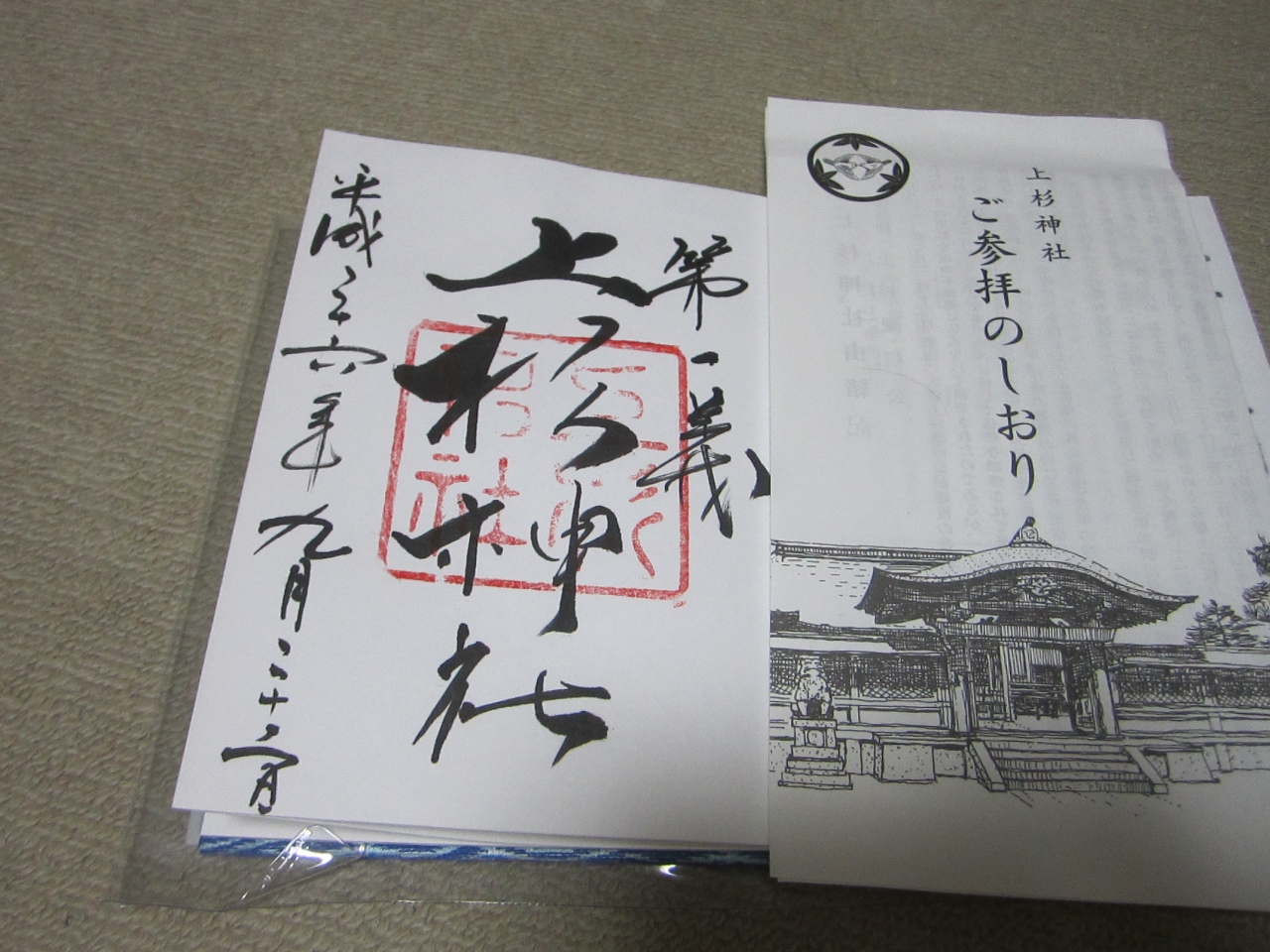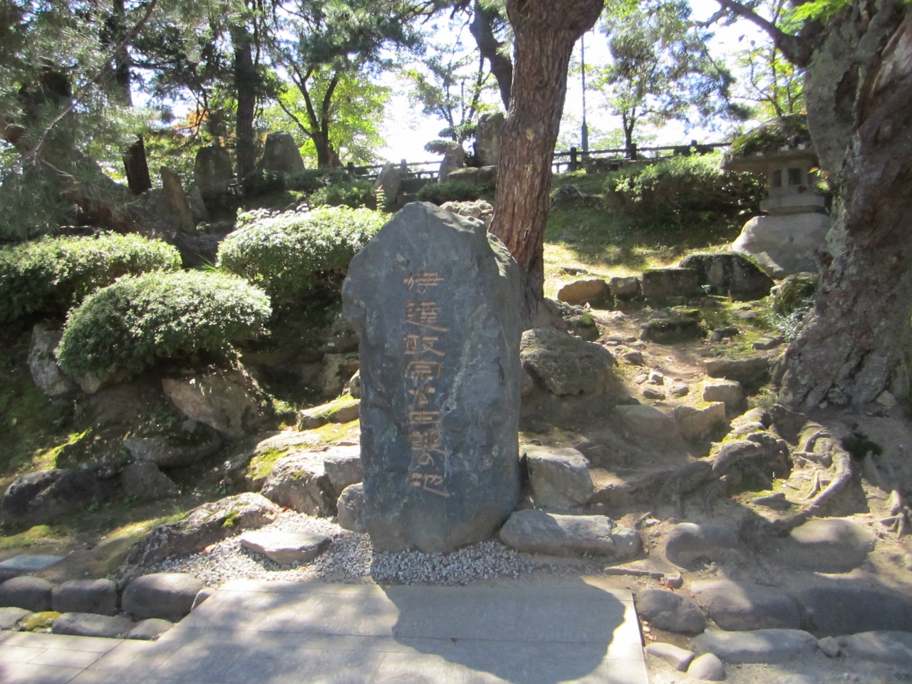 四角いお堀に囲まれた平城跡が神社になっています。もともと石垣や天守を設けていなかったようで、どちらかというと、城跡というよりも日本庭園のような印象を受けます。米沢城は伊達政宗が生誕した土地であるとともに、上杉景勝以来の上杉氏の居城でもあるため、伊達政宗生誕の碑の隣に上杉鷹山の銅像が並んで立っているという特異な情景が広がっています。神社の祭神は上杉謙信(明治時代に上杉鷹山も併せて祀られていたそうですが、別の神社に祀られるようになったそうです)。