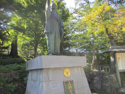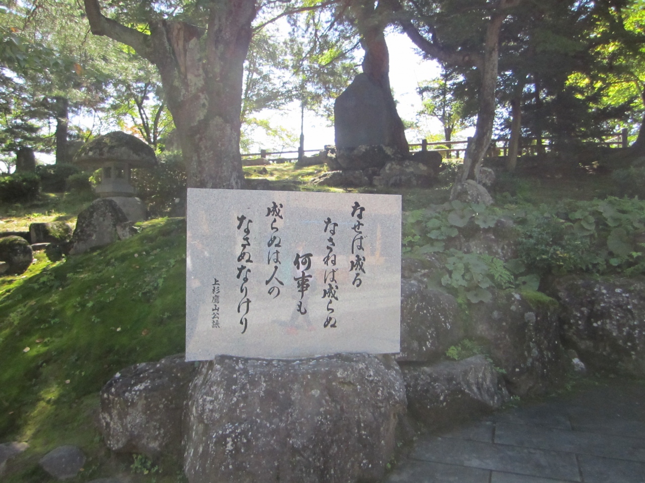 あのケネディ大統領が尊敬する日本人の一人として挙げたという、米沢藩中興の祖上杉鷹山の全身像です。銅像は富山の著名な作家の方が平成4年に作成したそうです(岐阜駅前の黄金の織田信長像なども製造した人のようです)。左手に帳面を持ち右手の扇子で何かを指す姿は、領地の巡視の途中をイメージしたものでしょうか。像の傍らには「為せば成る為さねば成らぬ何事も成らぬは人の為さぬなりけり」の言葉も記されており、名君の遺徳を偲ばせます。