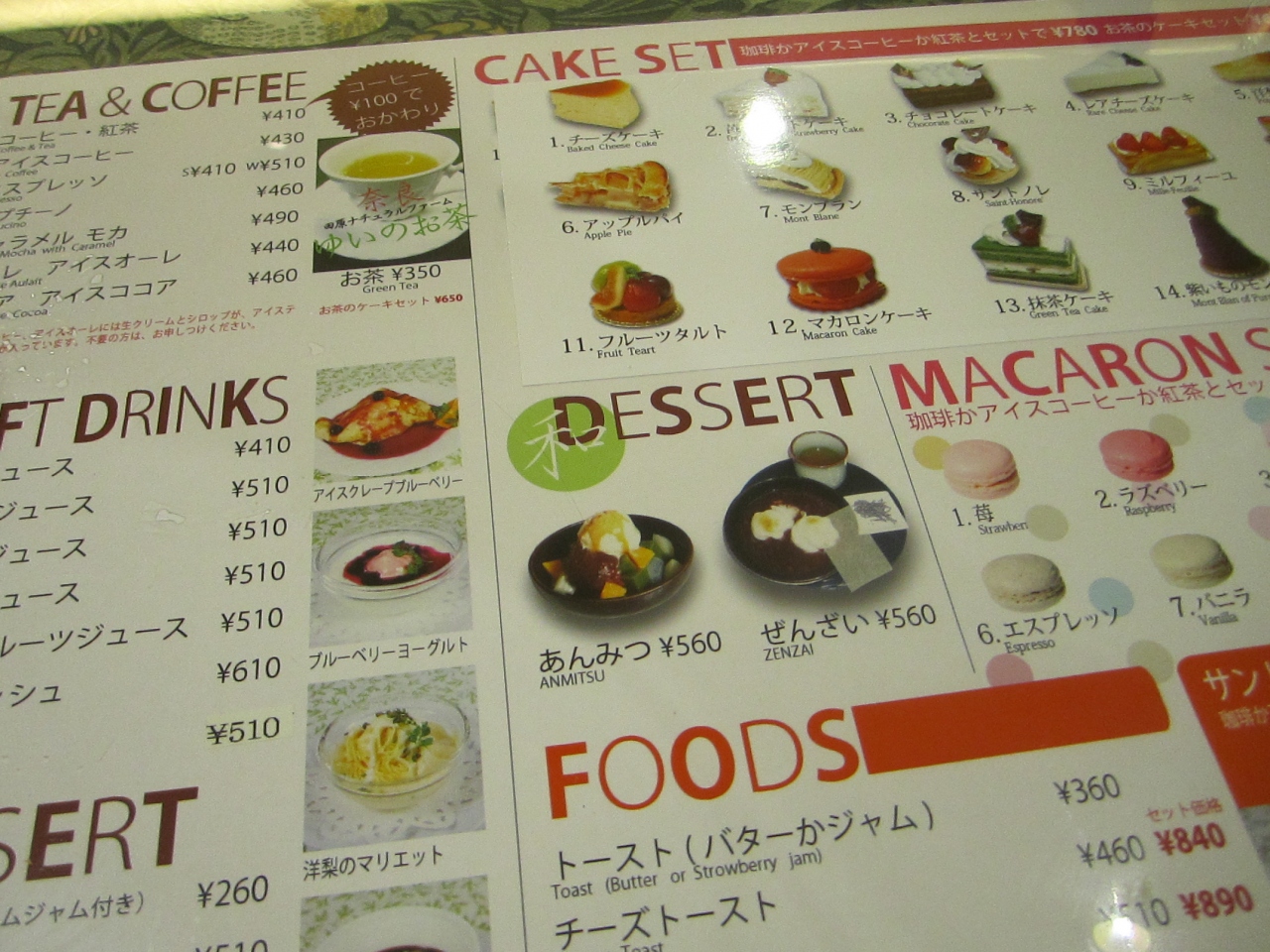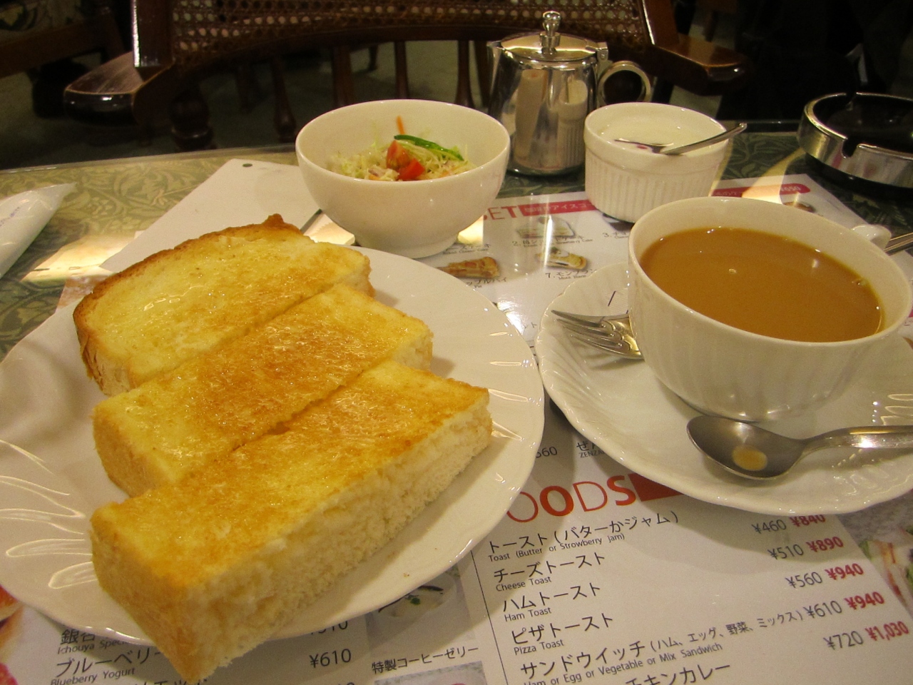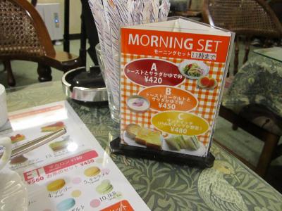 近鉄奈良駅すぐの東向商店街にある、スイーツのお店ですが、ケーキの並んだガラスケースの横を奥に進むとティールームがあり、店内でスイーツや軽食をいただけます。朝は7時45分頃から11時頃までモーニングメニューも出しており、500円以内でトーストとサラダ(あるいはゆで卵)、飲み物(コーヒー、紅茶)をいただけます。トーストには、バターかジャムのどちらかを塗ってもらえるので、その日の気分でどうぞ。