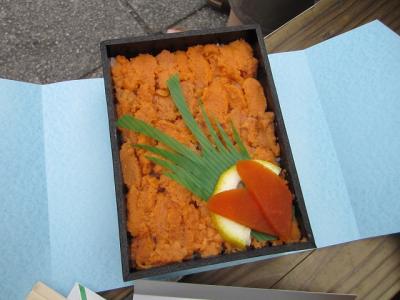 ウニ弁当のお味ですが、四角いお弁当箱一杯にウニが敷き詰められている上、ご飯自体もウニのエキスがたっぷりで、口に入れるとおいしさが口中に広がります(ウニは昆布やわかめを食べているので、昆布だしの旨みが濃縮されているのです)。単にご飯にウニのっけた弁当とは明らかに味が違ってました。