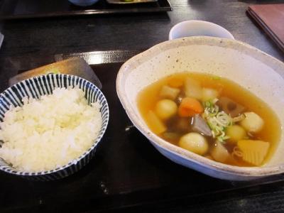 まめぶ汁は単品と定食セットの両方が注文できますが、今回はランチなので定食セットをいただきました。「あまちゃん」劇中でも語られていましたが、基本的には筑前煮的な根菜類の煮物に小麦粉で作ったお団子がはいっているものです。