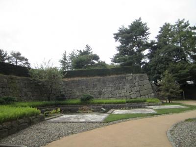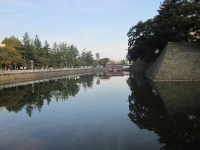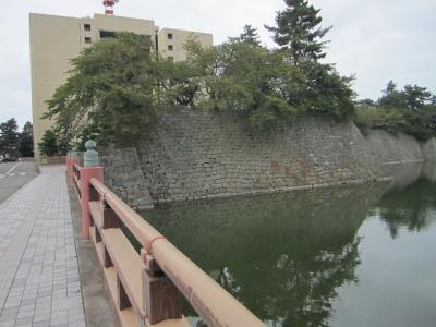 旧幕時代に本丸であった場所に福井県庁及び福井県警察本部が建設されています。本丸御殿などはそれら後世の建築物などによって跡形もありませんが、周囲約1kmの水堀に囲まれた端正な石垣と、県警本部の北側に残る天守台跡が往時を偲ぶよすがとなっています。本丸西側にかかる廊下橋は近年復元されたものだそうで、「コンクリート製の天守閣」といった安っぽいものではなくて相当程度の考証がなされた建築物と思われ、好感が持てました。天守台跡には石段を使って上がることができますが、構造物が無い状態でも堀の外を容易に見下ろすことができました。4重5階といわれる天守からの眺望も叶うものであれば楽しみたかったと思います。