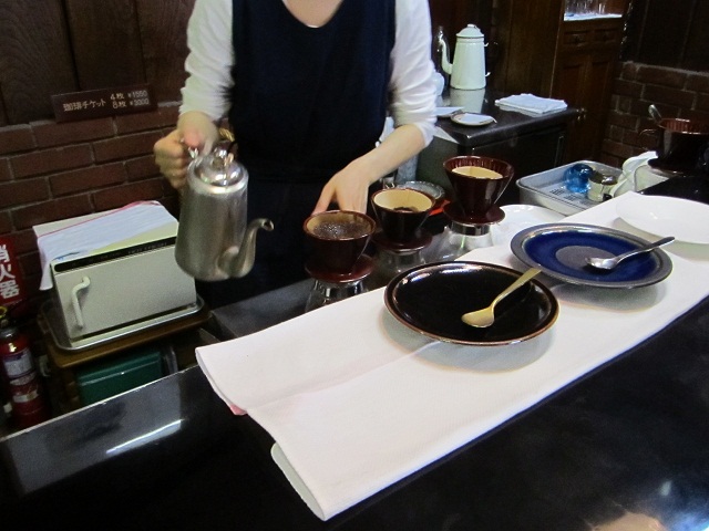 今回はカウンターに座ったので、間近でコーヒーの淹れ方をみていましたが、コンロで沸騰させた熱湯に少量の水を混ぜて少し温度を下げる、フィルター上の豆はしっかり蒸らす、蒸らしが済んだ豆にゆっくりお湯を回しかける、豆はこまめに挽くといった、おいしいコーヒーをいれるための基本を忠実に守っていました(当然、味は最高)。その間もひっきりなしにやってくる客の対応など、忙しそうに働く店員さんの様子を見れば、コーヒー一杯400円以上はそんなに高くないと思いました。- 旅行時期