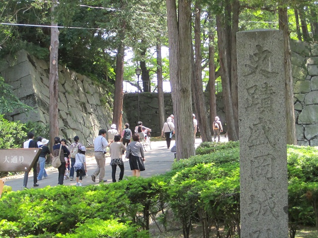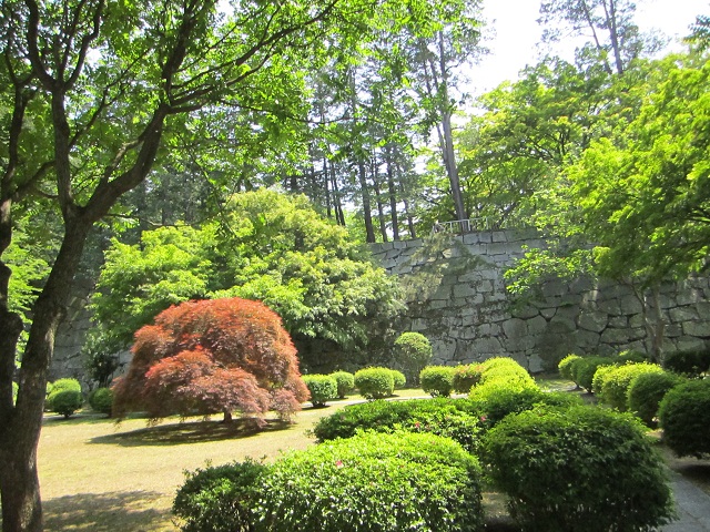 お堀端の石垣を見た瞬間に分かるほどのコテコテの織豊系城郭ですが、残念なことに上部建築物は取り壊されているらしく往時の姿を偲ぶことはできません。お堀内部の曲輪のあったところが現在では公園となっているらしく、「岩手公園」という名前の方が正式らしいです。