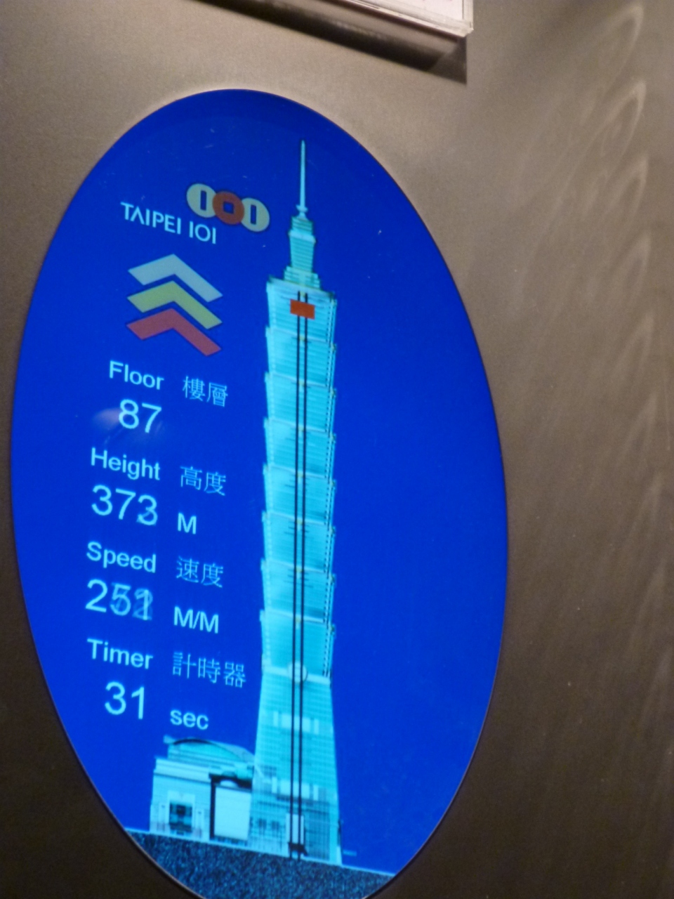 入場料は大人450元。どの国も展望タワーはお高めです。この日は生憎の雨模様でしたが、それでもエレベーターに乗るまでは長い列に並びました。途中、台北101を背景にした合成写真を係りの方が撮ってくれます。もちろん有料ですが・・・。