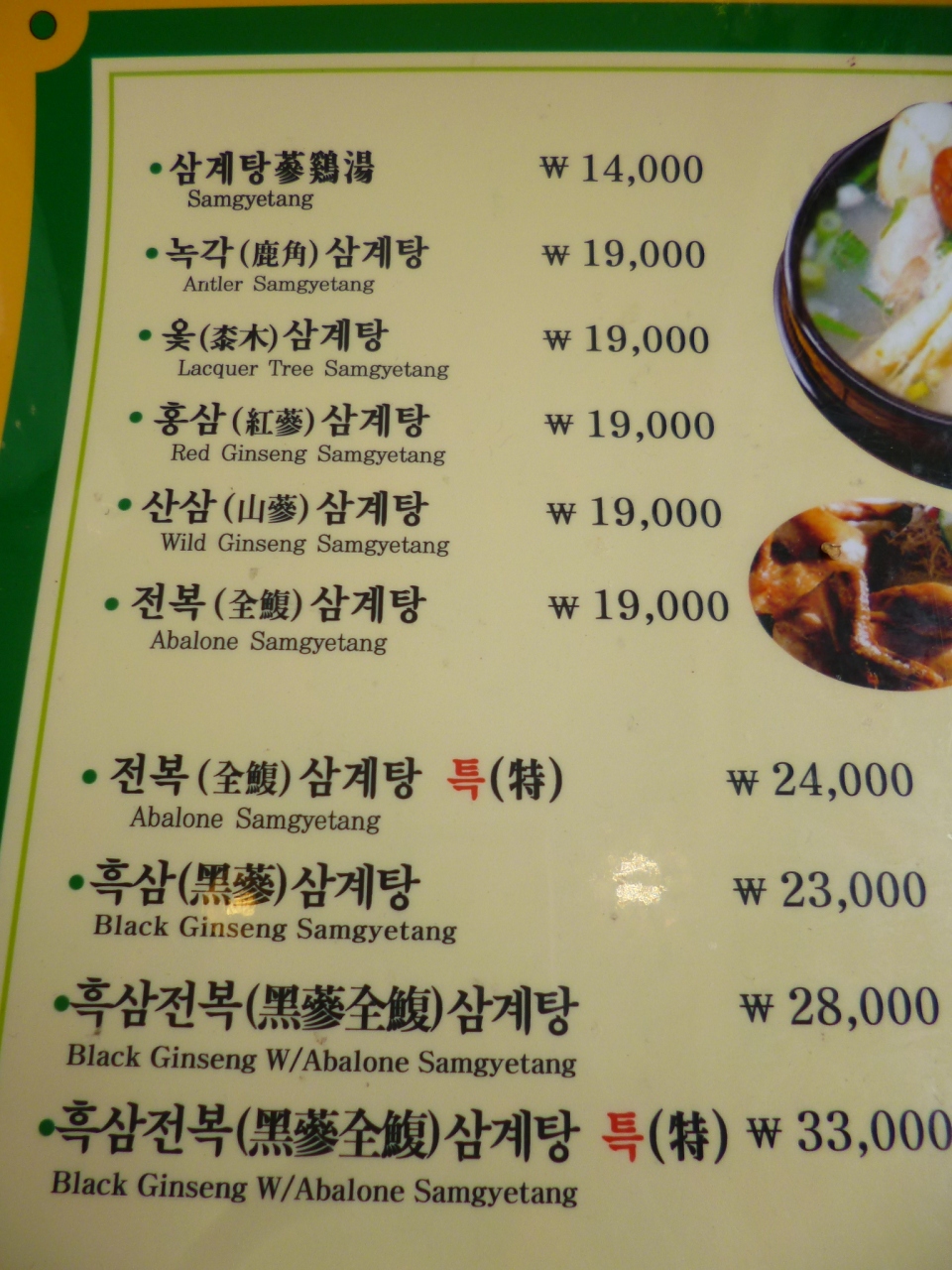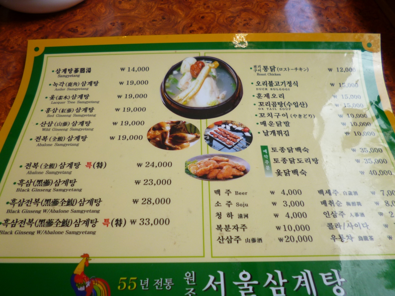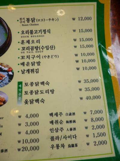 釜山を訪れた際は必ず朝食にこちらへ立ち寄ります。普通のサムゲタンでW14,000。(よく考えると贅沢な朝ごはんです)その他アワビ入りサムゲタンなどいろいろ種類があり金額が異なってきます。サムゲタンの他にも、やきとりやローストチキンもあるみたいです。