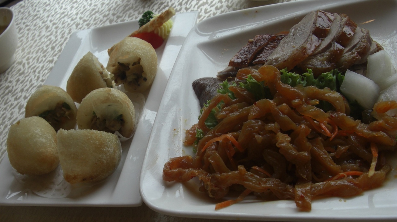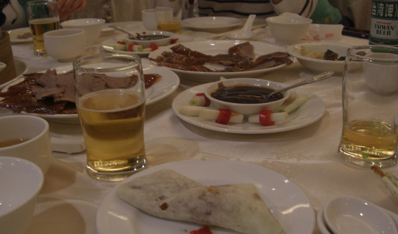 食べ方は、ご承知の通りアヒルの皮に特製のタレをつけ、小麦で作った皮にネギを一緒に入れて巻いて食べます。このタレが凄くおいしい。