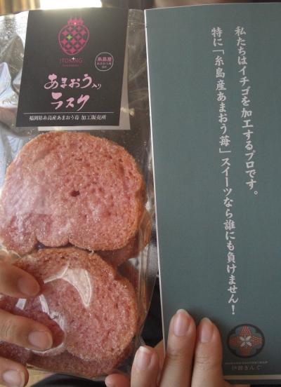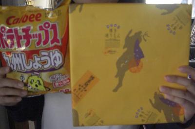福岡空港土産物センター(?)の中にある福岡名産いちごの「あまおう」を材料にした菓子(あまおうラスク、ひよこのあまおう)を購入。定番の博多通りもん、九州限定の大量のポテトチップスも。ひとまそめにして巨大な袋に入れて機内に持ち込んだ。