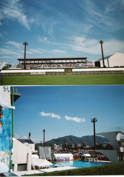 岐阜城に入場(200円)し展望デッキで見知らぬ一団に遭遇した際、いつもの様に声をかけると、複数の県の水泳コーチという。(本年度の国体は岐阜で開催されるものの、岐阜には大きな室内プールがないので、水泳だけ先に単独競技として開催)。彼らは興奮気味に「前日、平泳ぎで世界新記録が誕生した!!」というので、「あのメダリストか?」と聞くと、男の子だと。水泳会場を教えてもらい、すぐさま下山。歩いて水泳会場に向かったものの、ものすごい人だかりが。入場は無料とのことながら、とても並んで待つ人数ではなかったので、やむなく遠くから世界記録誕生プールを撮影しました。