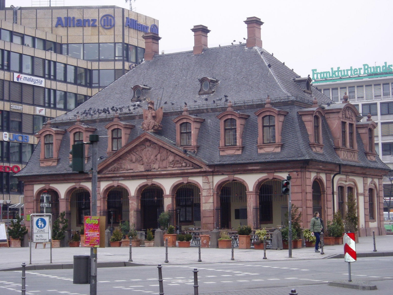 街の中心部にある、フランクフルトの市場。大きな体育館のような建物中に入ると、小さなお店がひしめき合う空間に。八百屋さん、各国のお惣菜屋さん、ドライフルーツ屋さん、お肉屋さん、パン屋さん、お茶やお酒を売る店、卵専門店などがある一階と鶏肉やお魚を売る二階があります。特に買いたいものがなくても、歩いてみるだけで楽しいですよ。昼時に行くと丁度中央部にあるソーセージ屋さんに長蛇の列が。ドイツ人も行列して食べるソーセージ。是非お試しを。