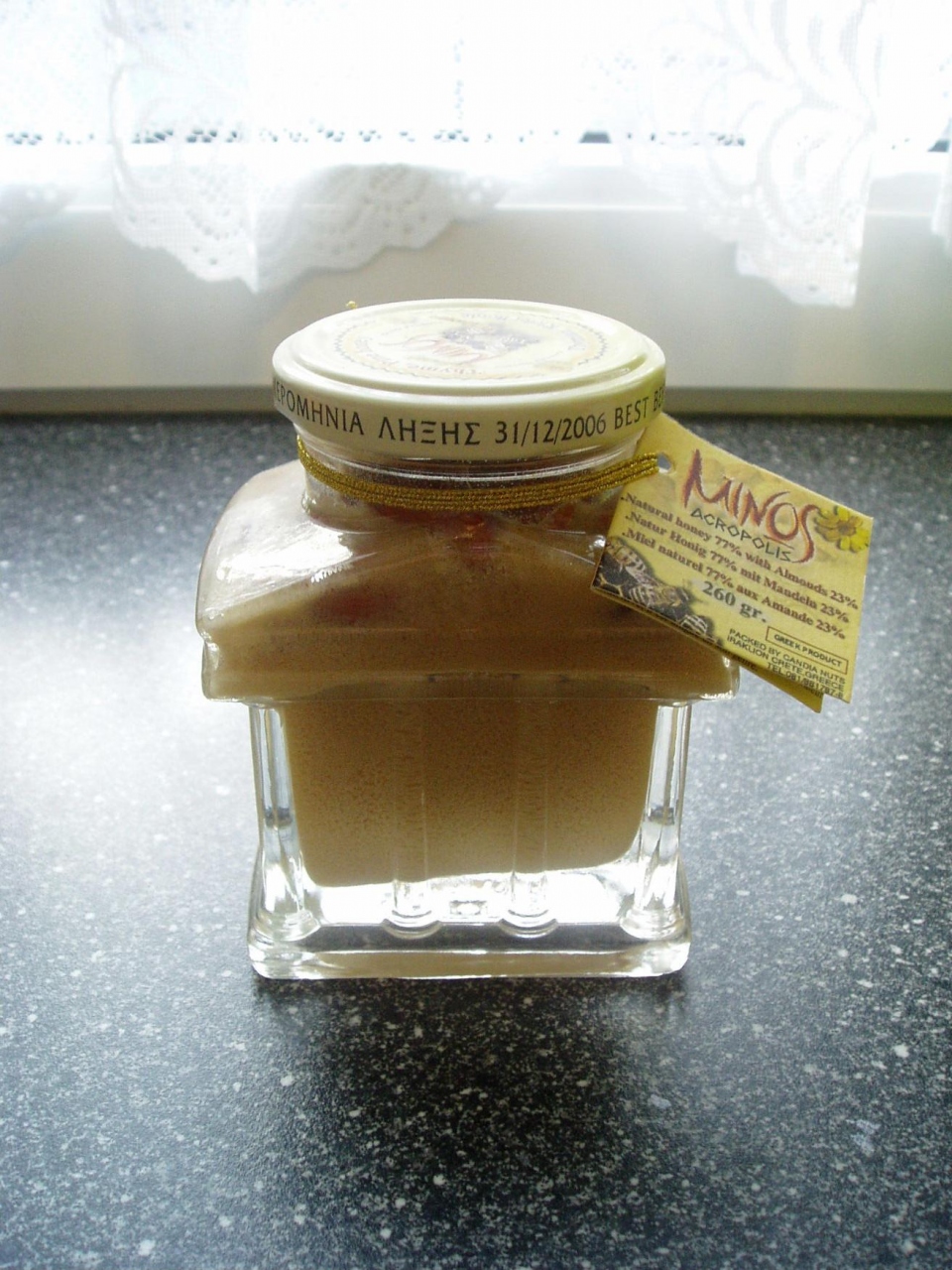 神殿型の瓶に入ったハチミツ。中にアーモンドが漬かっている。