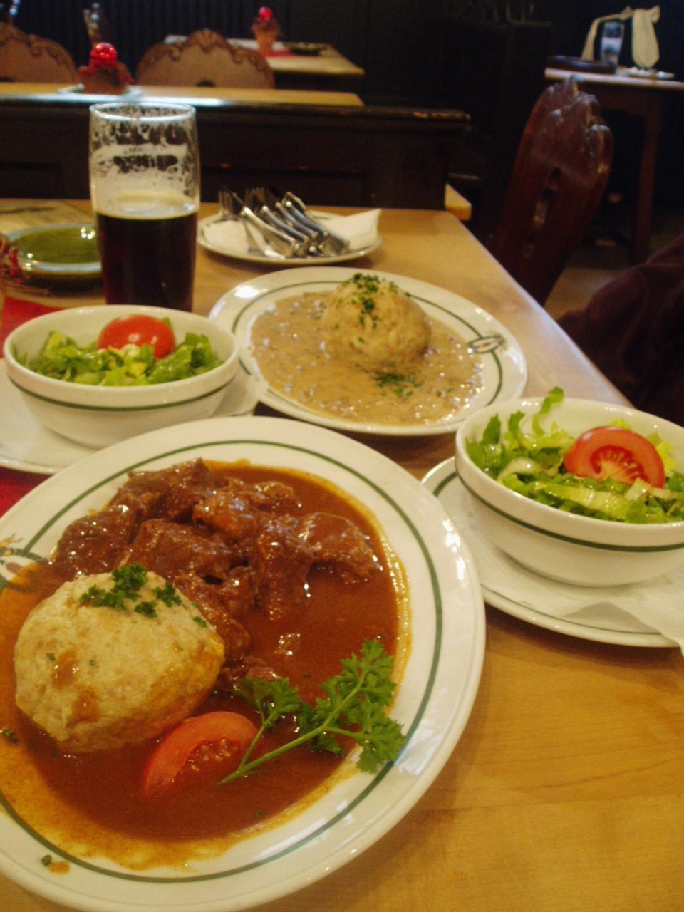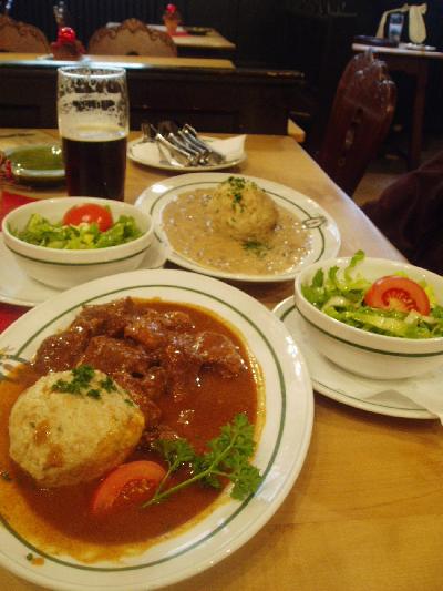 写真のメニューはビーフのグラッシュ、クヌーデル添え。