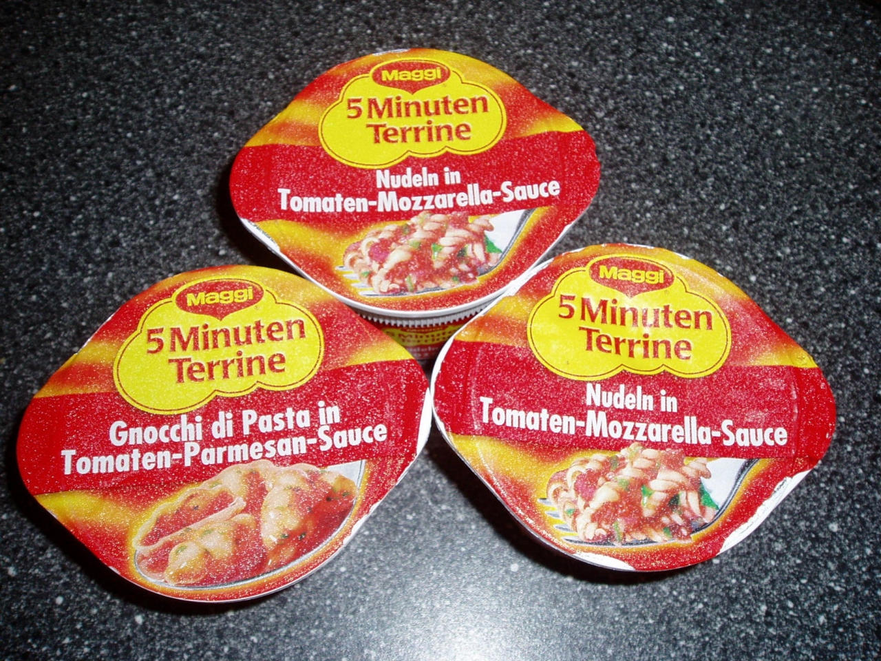 数社で作っていますが、日本でも有名なMaggiかKnorが選びやすいでしょう。お湯を入れてかき混ぜ、5分待てば、結構美味しい即席パスタが出来上がります。
