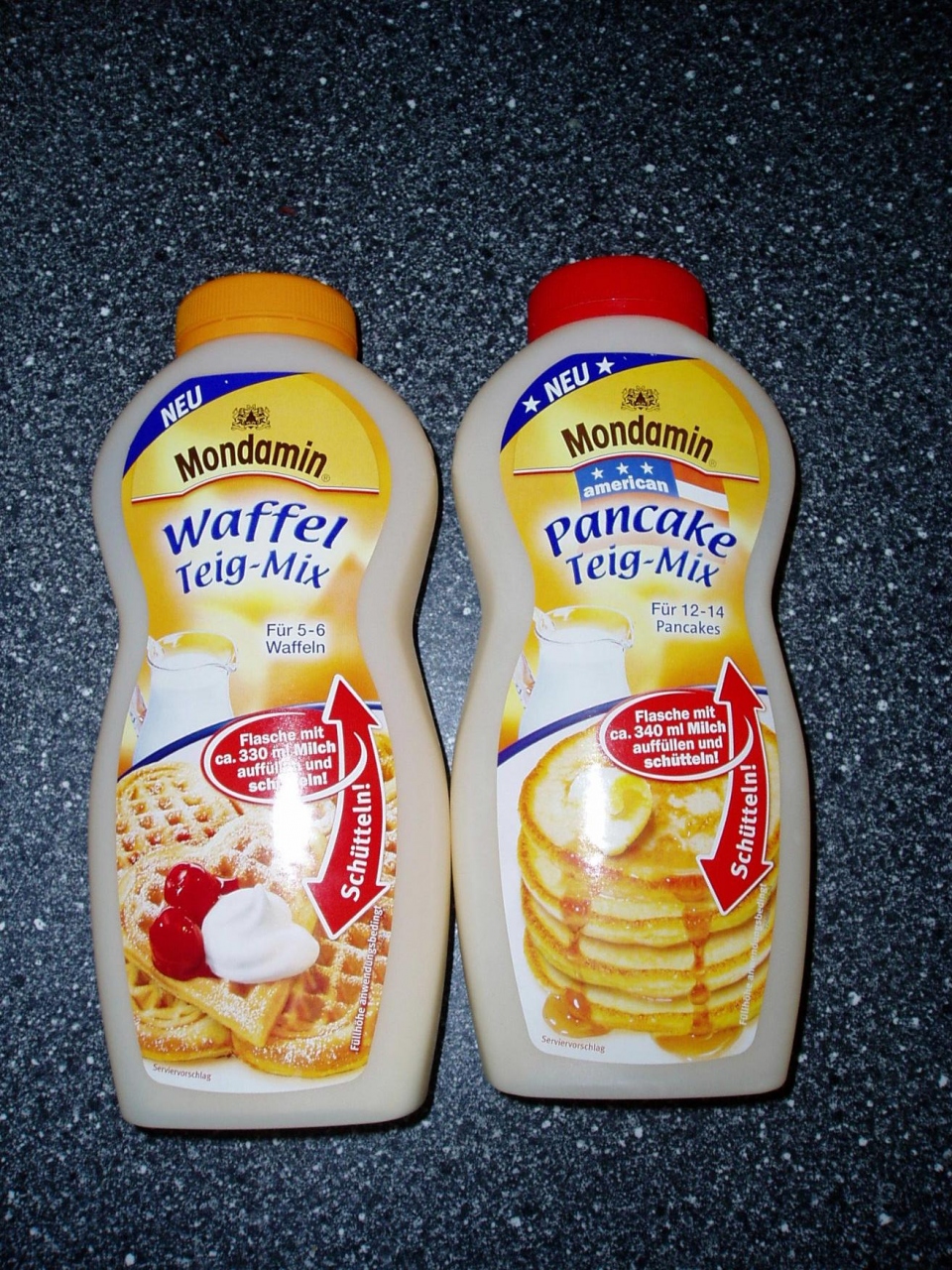 日本では「お口クチュクチュ・・・。」ですが、ドイツでモンダミンというと、コーンスターチのことです。モンダミンは色々な製品を作っている会社の名前であります。最近新商品がでて、「ミルクを入れて振るだけのパンケーキミックス、ワッフルミックス」が楽しいお土産になりそうだったので、クチコミにカキコミします。写真のほかにも、フラムクーヘン(ドイツのクレープ)などもあります。スーパーで買えるので、のぞいて見てください。