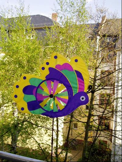 4月から9月くらいまで、ドイツの住宅のバルコニーでは、色々な形の風車が楽しませてくれます。それはもう、かえる、犬、ねこ、鉢、てんとう虫・・・。と色んな種類があるし、動物のモチーフではなく、レインボーカラーの風車だったり、天井からぶら下げてくるくる回るものだったりと、種類はとっても豊富です。お値段も2ユーロくらいから、10ユーロくらいが主流です、楽しいので、おみやげにも良いと思います。