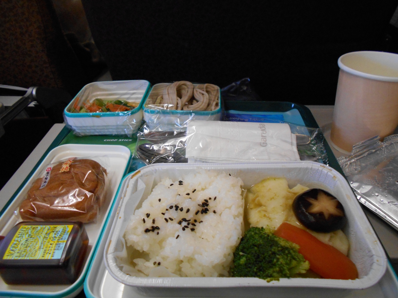 食事はやはり今一つ。行きの便ではインドネシア料理と和食があったが、インドネシア料理は売り切れだった。後部座席では希望が通らないのはどこのエアーラインも同じようだ。いつも思うのだが、7時間くらいのフライトなら食事のサービスは不要ではないだろうか? そうすればアテンダントの人数も減るし、コスト削減につながり料金が下がるのでないか。食事より睡眠に重きを置く人の方が多いと思う。- 旅行時期