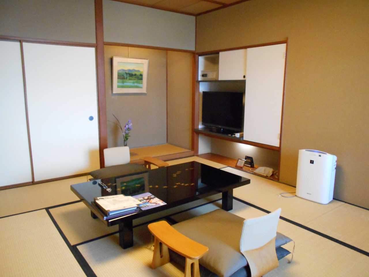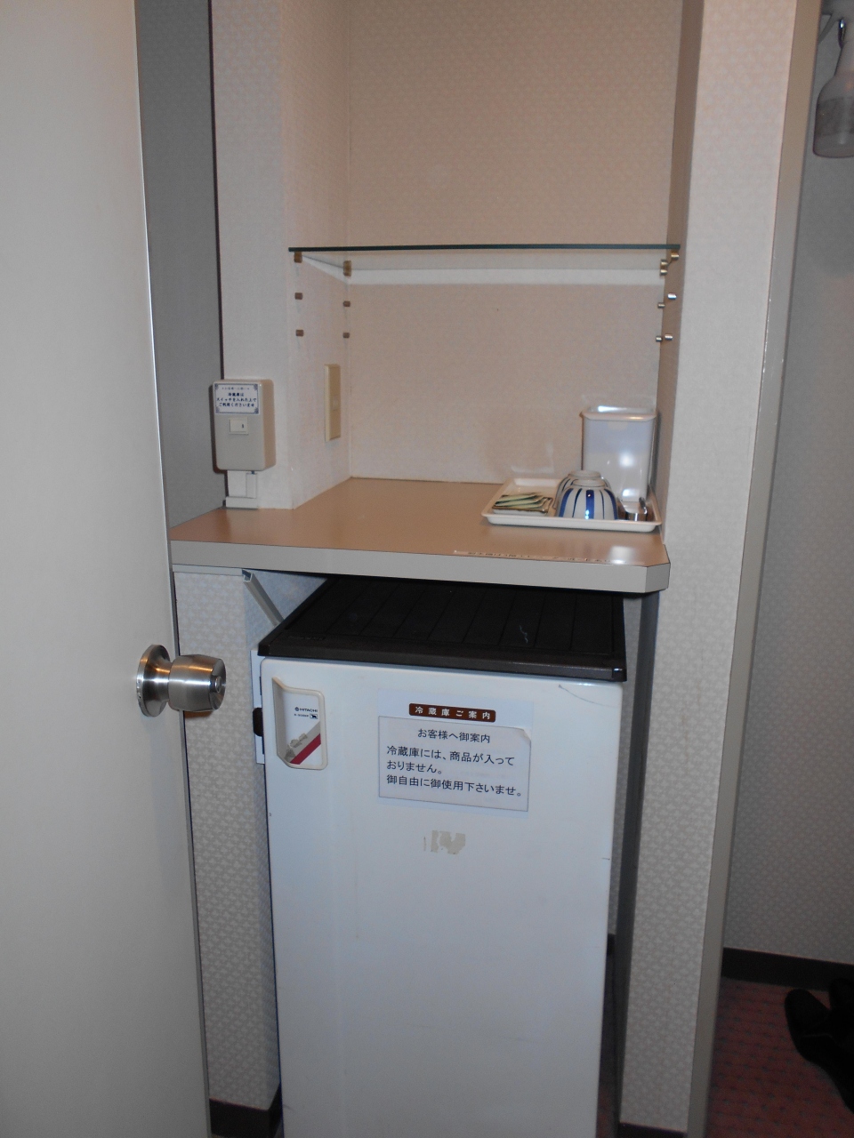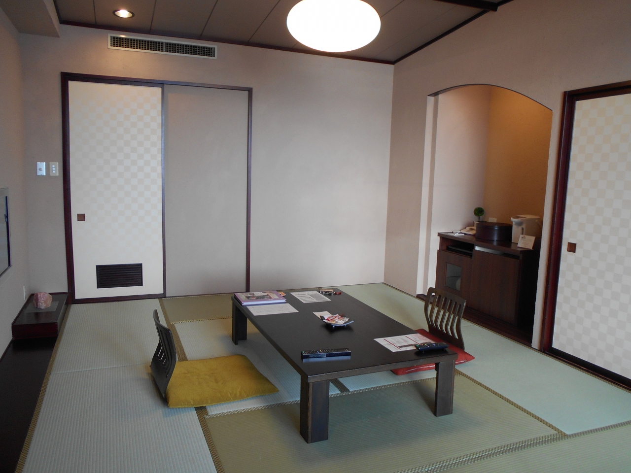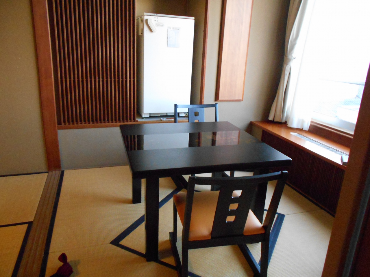 - 普通の和室10畳でした。窓側に板の間があり、椅子が置いてあったので助かりました。部屋には飲み物が満杯の冷蔵庫が置いてありました。冷蔵庫に飲み