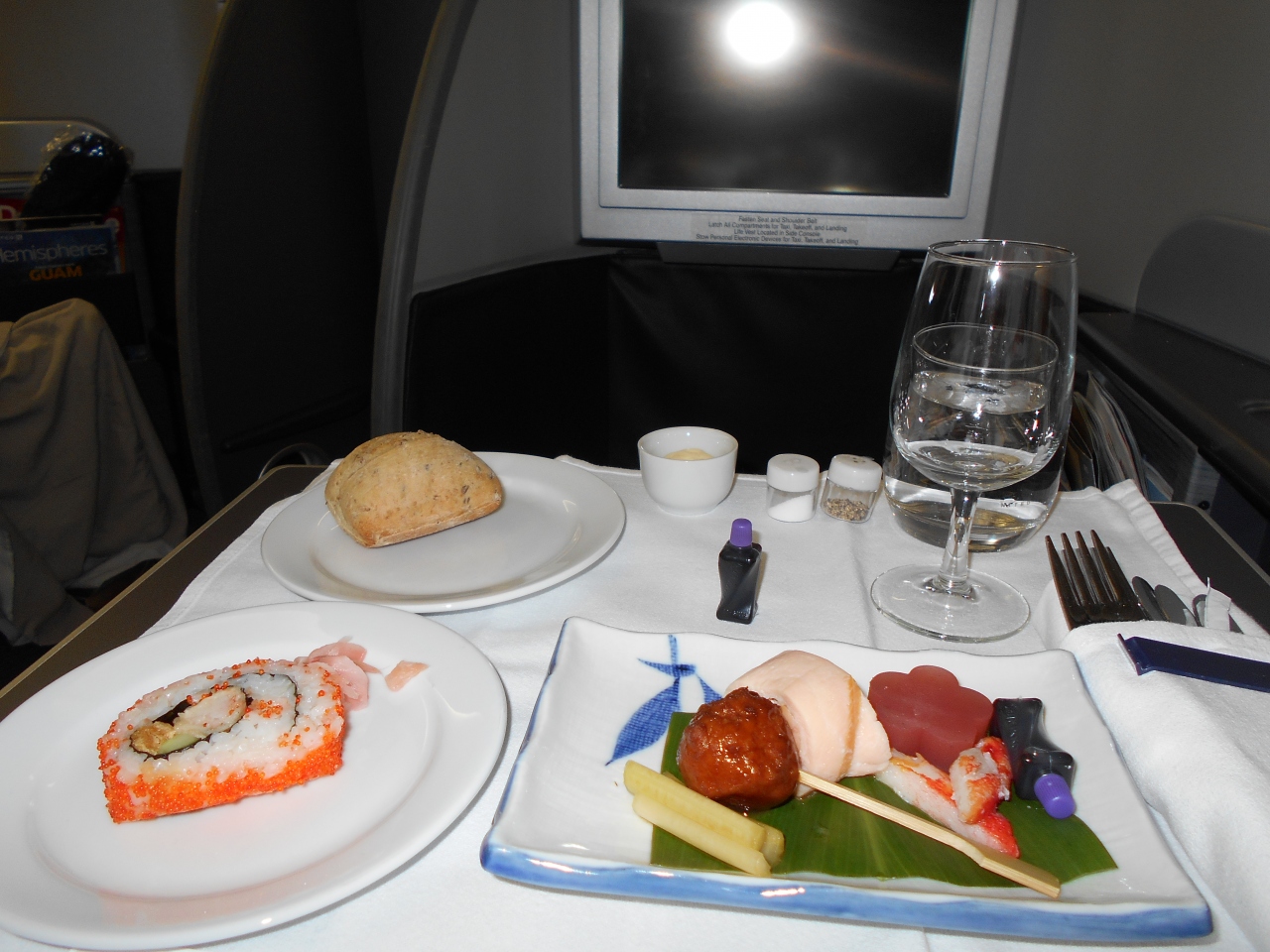 エミレーツやカタールには及ばないが、アメニティ(靴下とアイマスク)も配られた。エンターテイメントの機器はどこも同じようだが、コンテンツはあまり良くないように思えた。(好みがあるので)