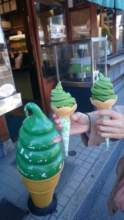 歴史を感じさせる建物が、道路を挟んで両側にズラッと並んでいて、情緒溢れる光景が広がっています。団子やアイス、お饅頭など店頭で実演販売しているものも多く、甘い香りが漂っていて食欲をそそります。抹茶のソフトクリーム、こんな濃い抹茶のアイスは初めてで抹茶好きの私にはたまらなかったです!ただ、午後からは人で込み合ってきて、歩道が狭いので車道にはみ出ている人もいて危なかったので注意が必要です。