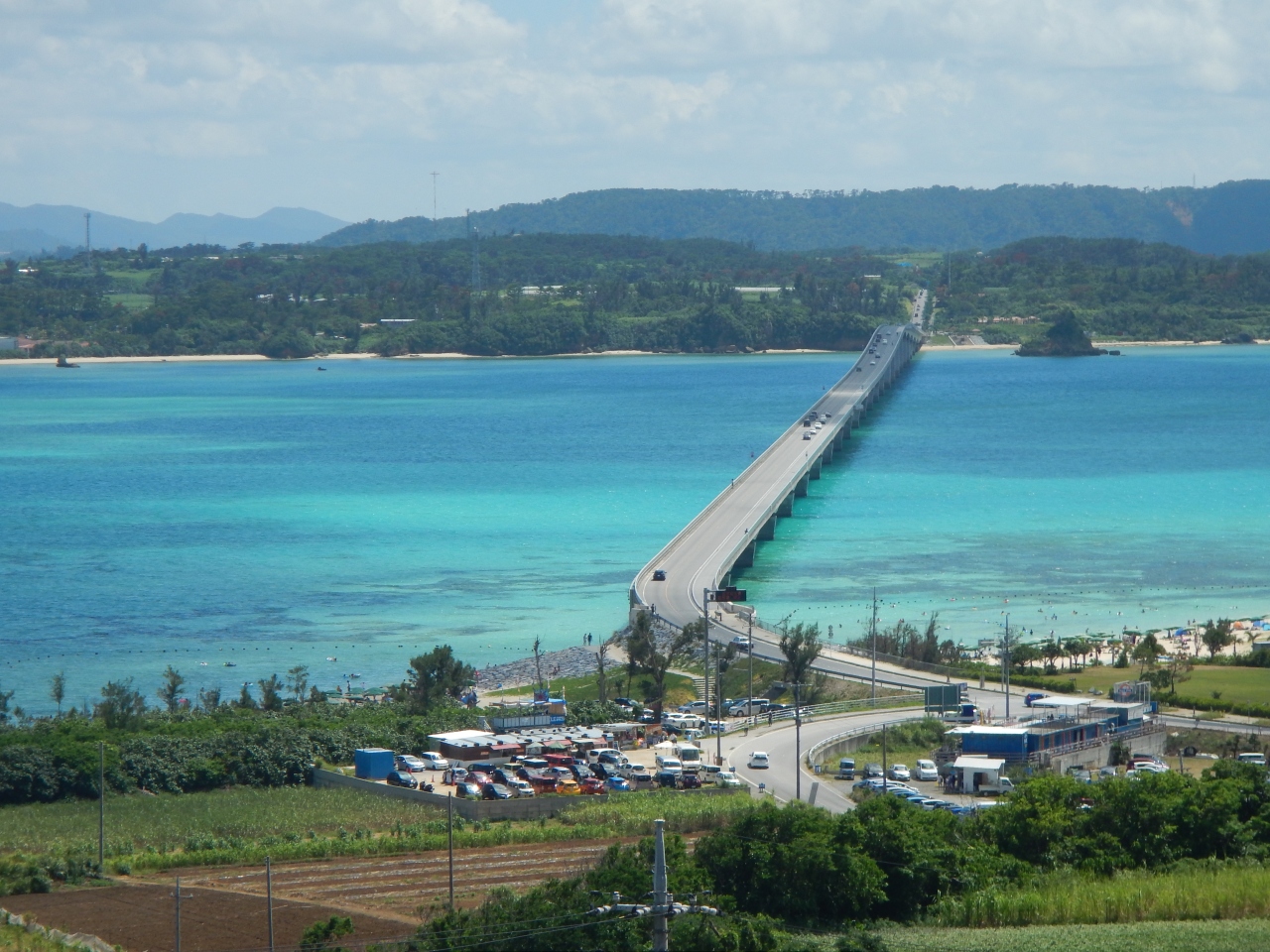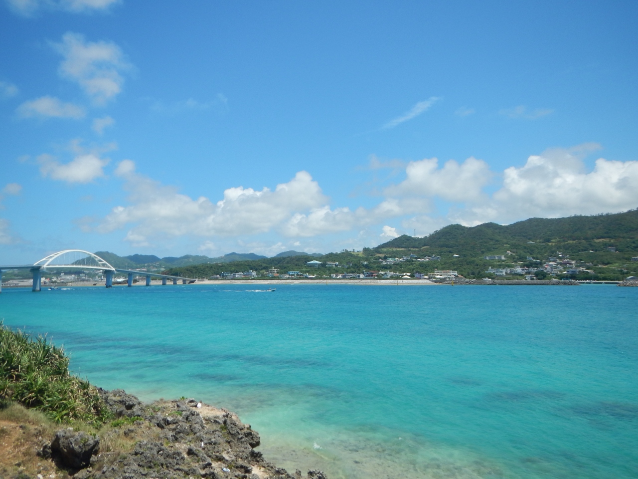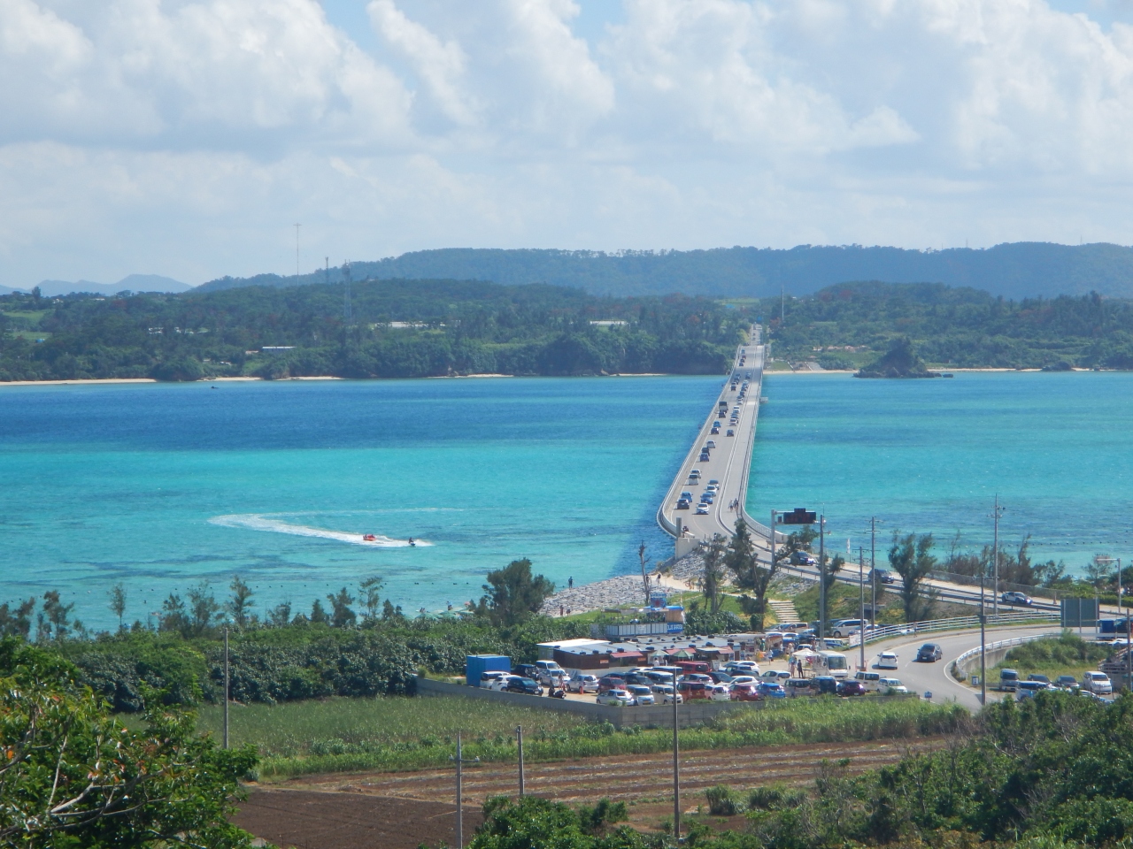 沖縄北部から瀬底島を結ぶ大橋で、お盆休みだったのもあり、橋を渡ったビーチでは、パラセールやジェットで賑わってました。