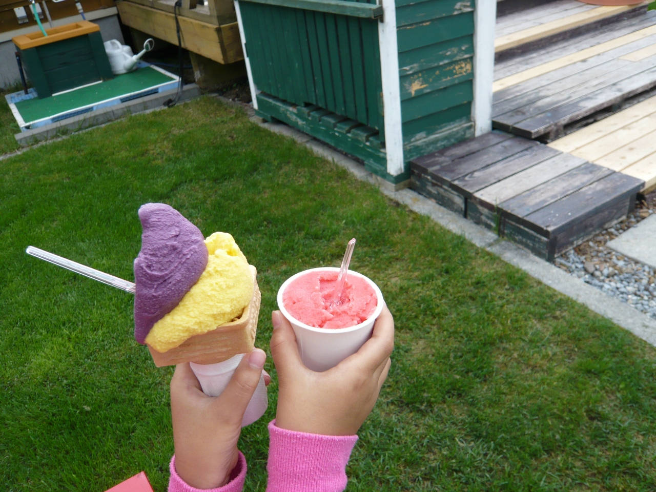 前に函館に行く途中に見つけてとても気になっていたので、先日友人のお見舞いに函館に行く途中、寄りました。マンゴー、紫いも、イタリアンチョコ、野いちご食べましたが、紫いもはおいしかったけど、他は、あまり私の好みではなかったです。あっさりが好きな人にはよいかも。友人にもお土産と思い、カップに入ってるアイスを5個買ったのですが、店員さん、普通のビニール袋に入れて渡されたのにちょっとビックリでした。言わなかった私も悪いのですが、お土産に買おうと、言いながら選んでいたのを店員さんもしっかり見ていたのに・・・保冷用の袋ないんですか?あります。保冷剤ないですか?あります。1つ1つ聞かなきゃ対応してもらええず...多分もう寄らないと思います。