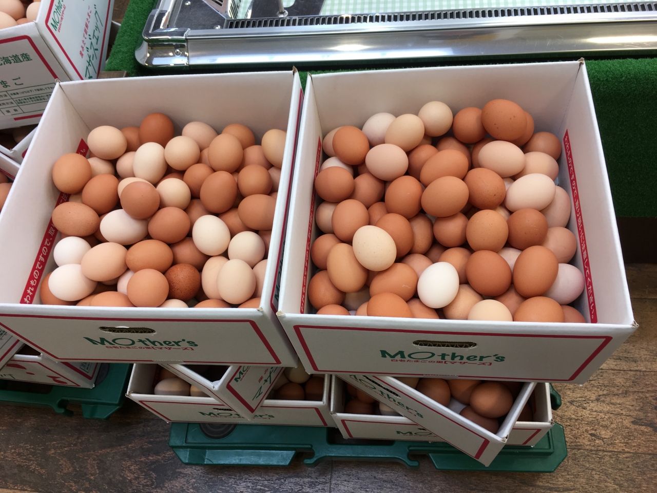 行った時間が遅かったせいか、たまごかけご飯が食べれる時間は終わってしまっていましたし、スモークレックも1本しか残っていなかったので買えませんでした。1箱70~80個入った卵がたくさん売られていました。