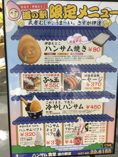 伊達市道の駅の中に入っている、ハンサム焼き(たい焼き的な感じ)のお店で、ハンサム焼きの他にも、伊達市の黄金豚を使ったソーセージや、ブウ玉(たこ焼きの豚肉バージョン)、ソフトクリームなどが売られています。ハンサム焼きは以前食べたので、今回はソフトクリームを食べました。まあ普通に美味しかったです。