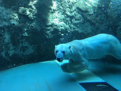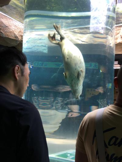 ガラス張りの水槽が横から床にかけてあってそこから筒状の水槽が縦に伸びていてあざらしたちがグルグル回れるようになっているのですが、行ってしばらくはなかなか筒状の方に入ってきれず、なかなかシャッターチャンスが訪れずでしたが、子供のアザラシなのか、小さいアザラシがサ~っとやってきて何回も何回も筒の中を上から下から泳いでくれました。観光客の目を引き付ける、このアザラシちゃんと、この工夫された水槽に感動しました。