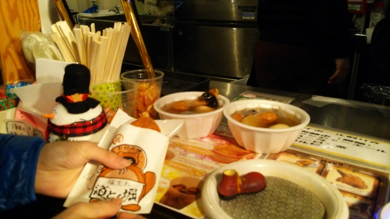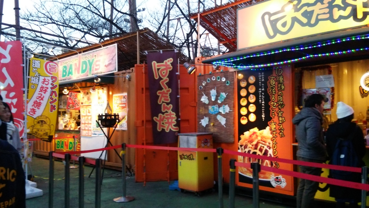ジェットコースターの乗り場の前にあります。イルミネーションを見に行った日は、とても冷え込んだ日で、あるっていても、観覧車に乗っても寒さに震えていたので、温かいおでんは美味しかったです。豚汁は完売していました。バクダンたこ焼きなどは若い人たちがたくさん並んでいました。