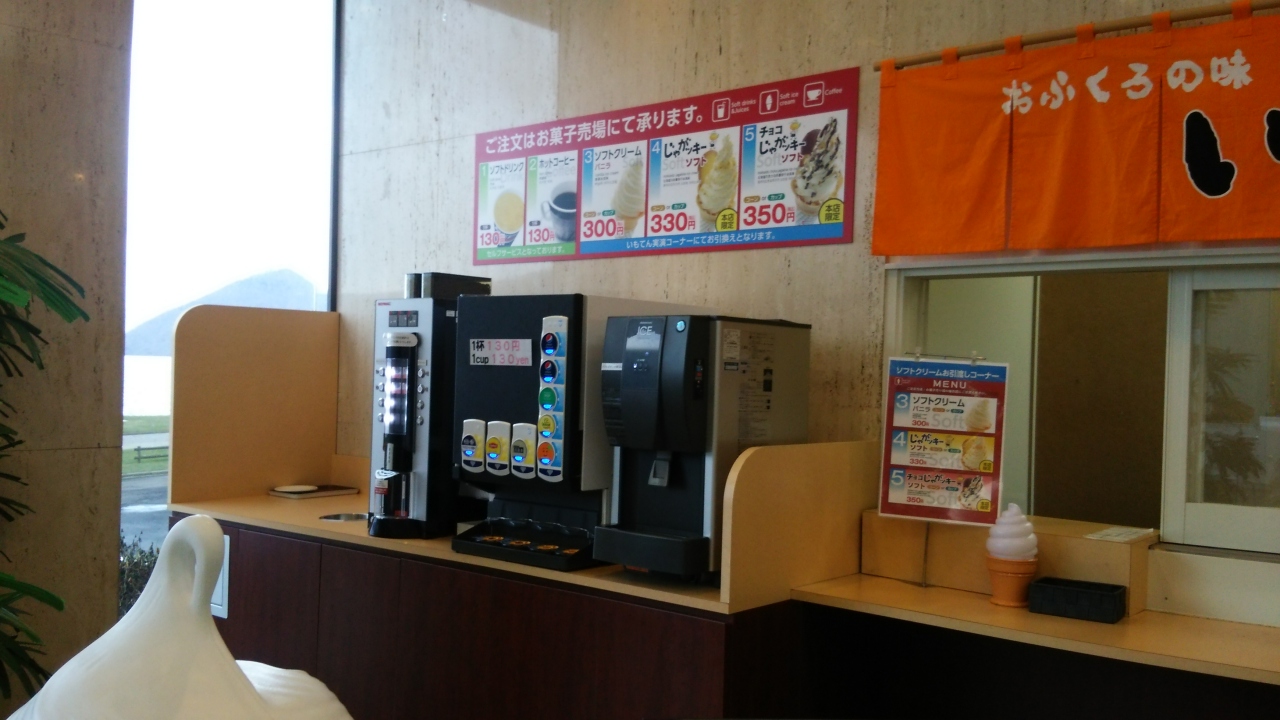 揚げたてのいもてんを買いに寄りました。日持ちのするお土産用のいもてんも美味しいですが、賞味期限2日の揚げたてのいもてんは本当に激ウマです。久しぶりに来ましたが、ジャガクッキーソフトクリームが販売されていました。