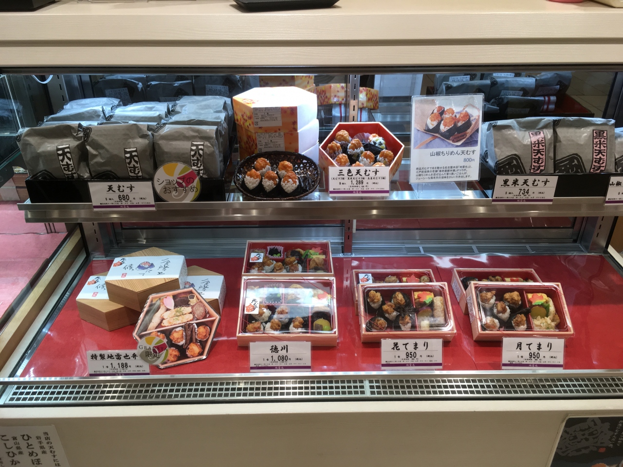 JR東京駅グランスタにある天むすのお店です。5個入りの天むすや黒米天むす、天むす、黒米天むす、高菜天むすが3個ずつ9個入った天むすの他に、おしゃれな感じのお惣菜が入った天むすのお弁当もあります。お土産に5個入りの天むすを買いました。甘いたれがご飯にしみて美味しかったです