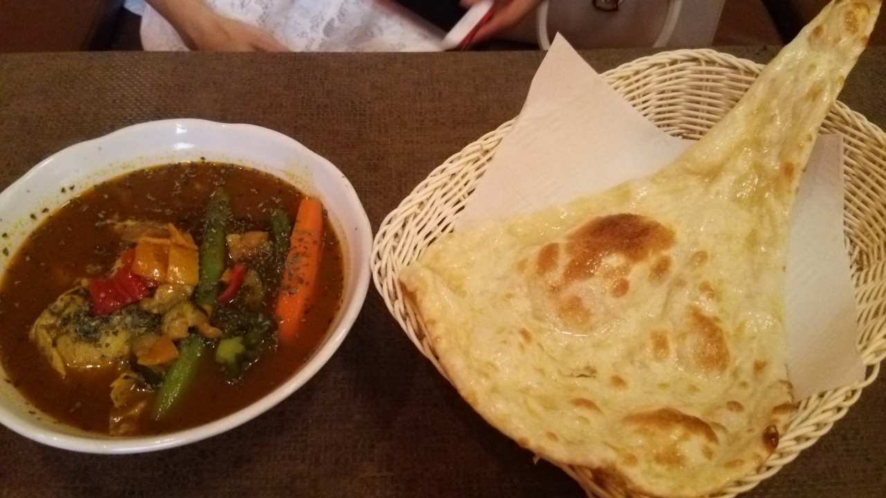 茨城から来た妹がスープカレーを食べてみたいということで、登別にあるネパール料理店へ。チキンベジタブルのスープカレーを食べました。私は辛さを3にしたのですが(バーモンドカレーの辛口くらいかな)もう少し辛くても良かったかな。私にも妹にもちょうどよい香辛料の風味で美味しかったのですが、冷めると少しスープが薄かったです。ランチタイムはナンとライスが食べ放題なのですが、顔より大きかったのでお代わりできませんでした。全体的に美味しかったです。