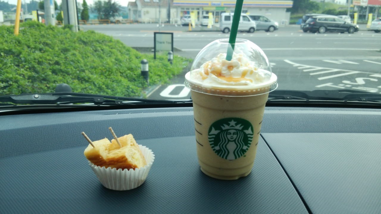 実家の近くにあって買い物の途中にあるので、帰りにドライブスルーで寄ることが多いです。この日も妹と買い物帰りに寄りました。私はいつもの抹茶フラペチーノ、妹はキャラメルフラペチーノを注文、試食にカステラのようなケーキもいただきました。やっぱり美味しいスタバです。