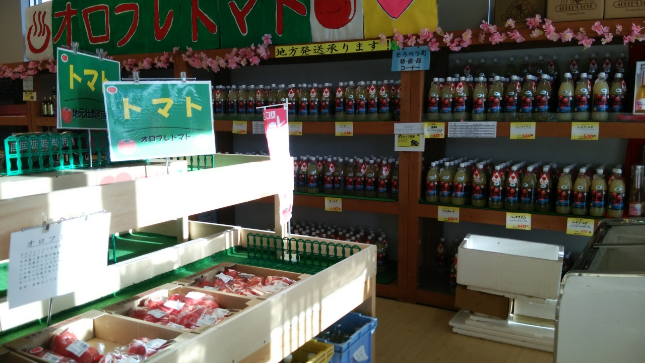 道の駅そうべつ情報館iの横にある、壮瞥でとれた農産物直売所です。壮瞥と言えば、リンゴが有名で、お店に入ると、右手に色々な種類のリンゴジュースが販売されています。他にもかぼちゃのケーキやピーマンのジャムなど販売されていました。