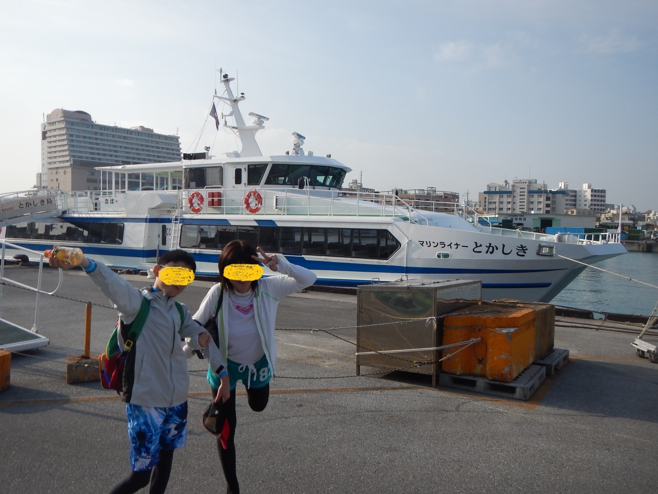泊港から渡嘉敷島まで35分の高速船です。フェリーの半分のじかんで着くので便利ですが乗船代も往復5000円弱と結構なお値段です。私たち家族はシーズンオフだったので席もガラガラでしたが繁忙期が絶対予約が必要と地元のインストさんが言っていました。