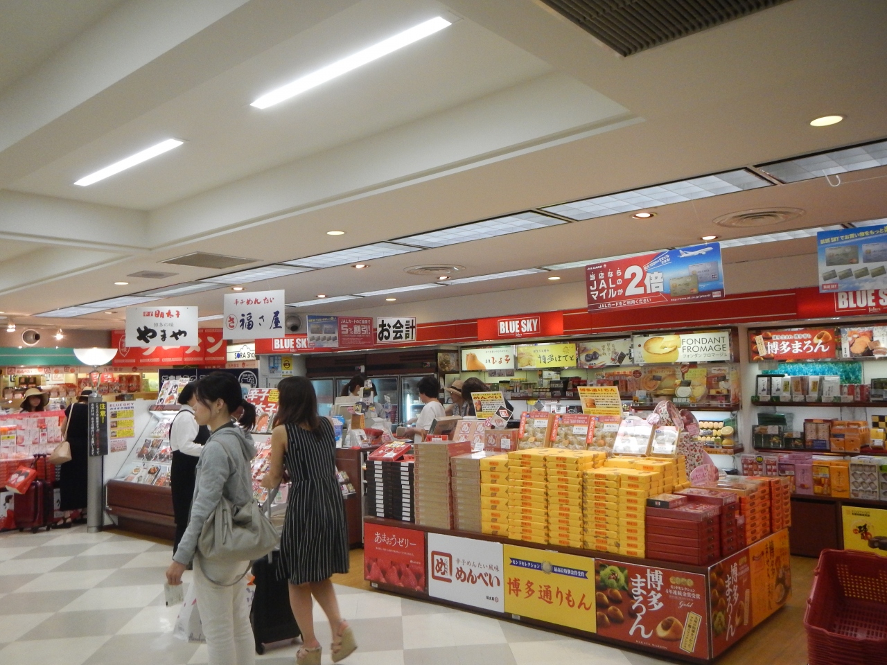 国内線第1ターミナルにあるブルースカイです。何せ1年ぶり二度目の福岡乗り継ぎなので第1も第2もよくわからず、こんなに狭かったかなあと思いながら買い物してました。品数は第2のブルースカイと変わらずそれなりにあります。博多通りもん、1度買ってハマり、自分用にもお土産用にもたくさん買いました。