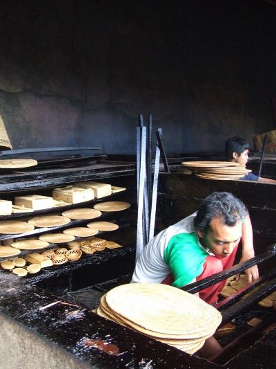 • 編み上げたアシタバ細工をいぶしてあめ色に仕上げていきます。いぶすことで...