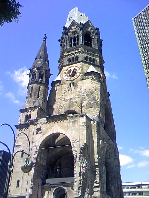 1888年に死去したヴィルヘルム皇帝のために19世紀末に建てられたロマネスク様式の教会です。1943年の空襲で破壊されたモニュメントとして修復しないでそのままの姿で保存されています。
