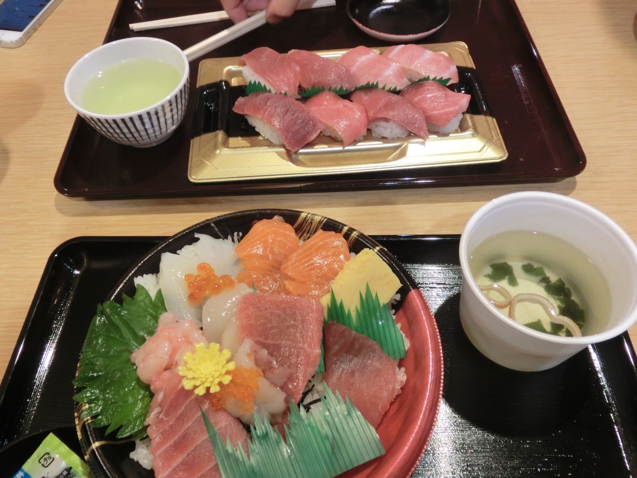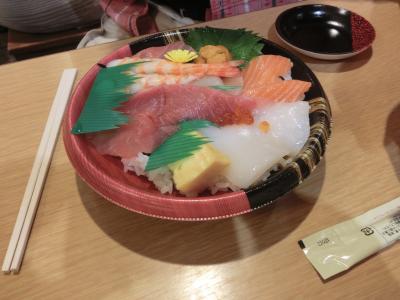 特に、ここ「まぐろや」は、中トロ、大トロ、うに、いくら、いか、えび、ほたて、サーモンなどが山盛りで、¥1300 安い!!15:00ごろだったこともあり、安くなっていてラッキー!!