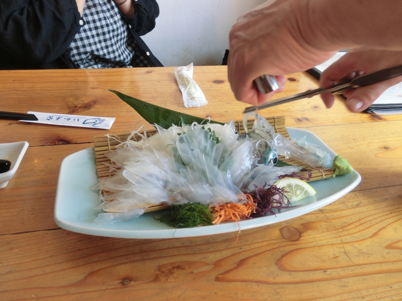 はさみで動いているいかの下足を切ってたべさせてもらえます。