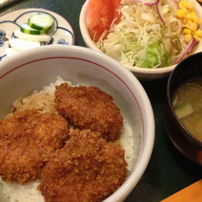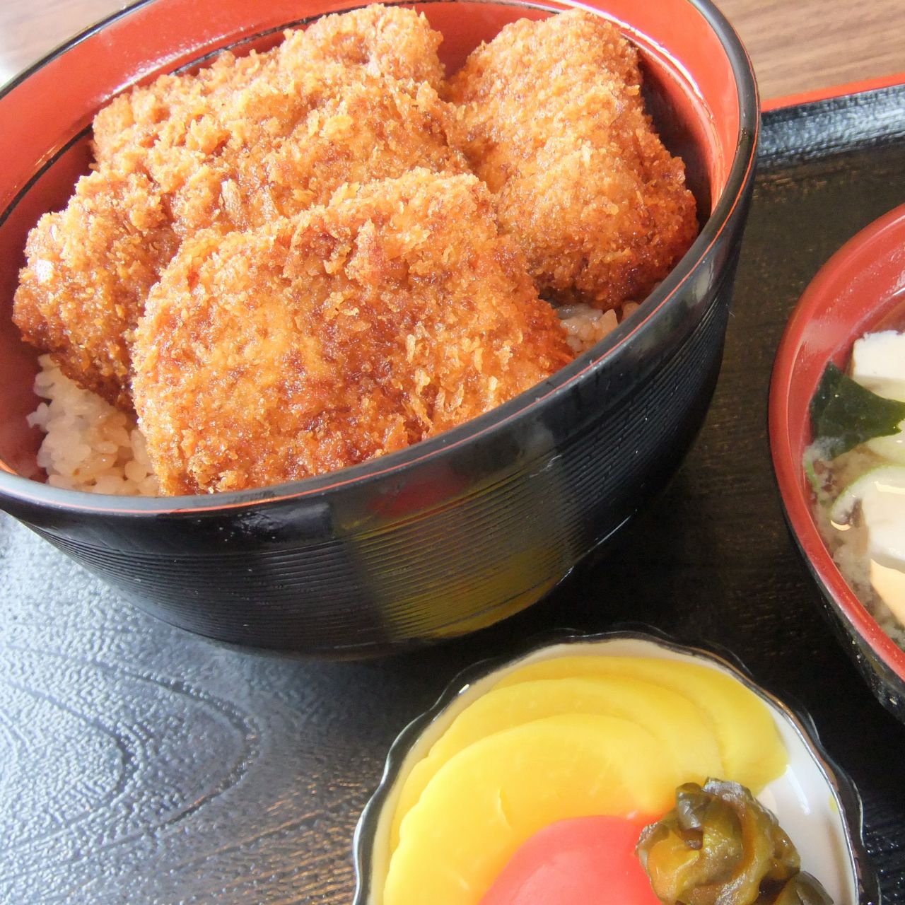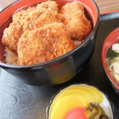 通常のソースかつ丼は、カツ4個でサラダ、味噌汁、お新香付きで870円。