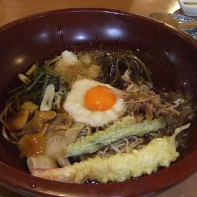 大きな塗の椀に盛られた蕎麦に、キンピラ、とろろ、玉子、山菜、