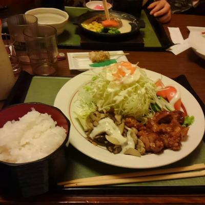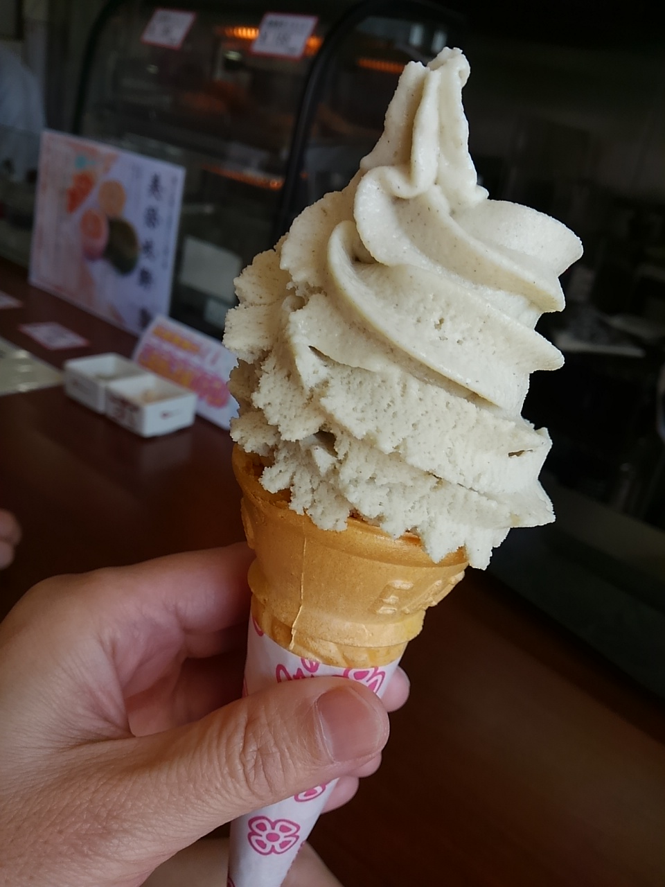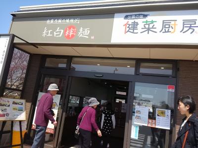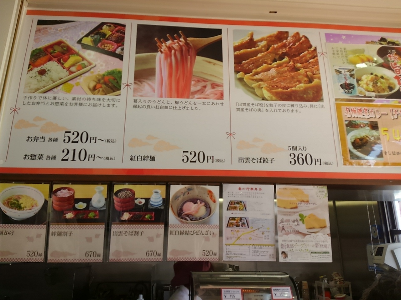 出雲大社近くになると人も多いしお値段も高くなるだろうと少し手前に行きました。となりがコンビニで駐車スペースもいっぱい。おまけに向かいには道の駅(資料館だったの食事はできません) やはり、ここへ来るとそば! あったかいそばがなかったので割子そばにしましたが、春らしくピンクのそばも(^_^) そして おべんともありお味噌汁がついていました。お母さんたちが愛情たっぷりの手作りでおもてなし。そして そば餃子にびっくり。ばあちゃんは買って帰りたかったけどその日は泊まり・・・残念がってました。そば粉の皮・中にはそば粉もはいってました。仕上げはそばソフト。クセもそこまでなくお試しあれ!