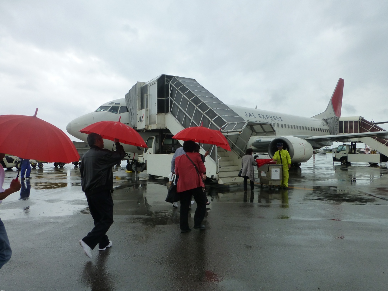 石垣空港で初めて雨に降られてしまいました。手荷物の中には折りたたみ傘が入っていましたが、タラップまでトランスオーシャンが用意した傘を借りました。こんなことは初めてですし、新空港ができたら傘を差して飛行機に乗ることなんてないと思います。