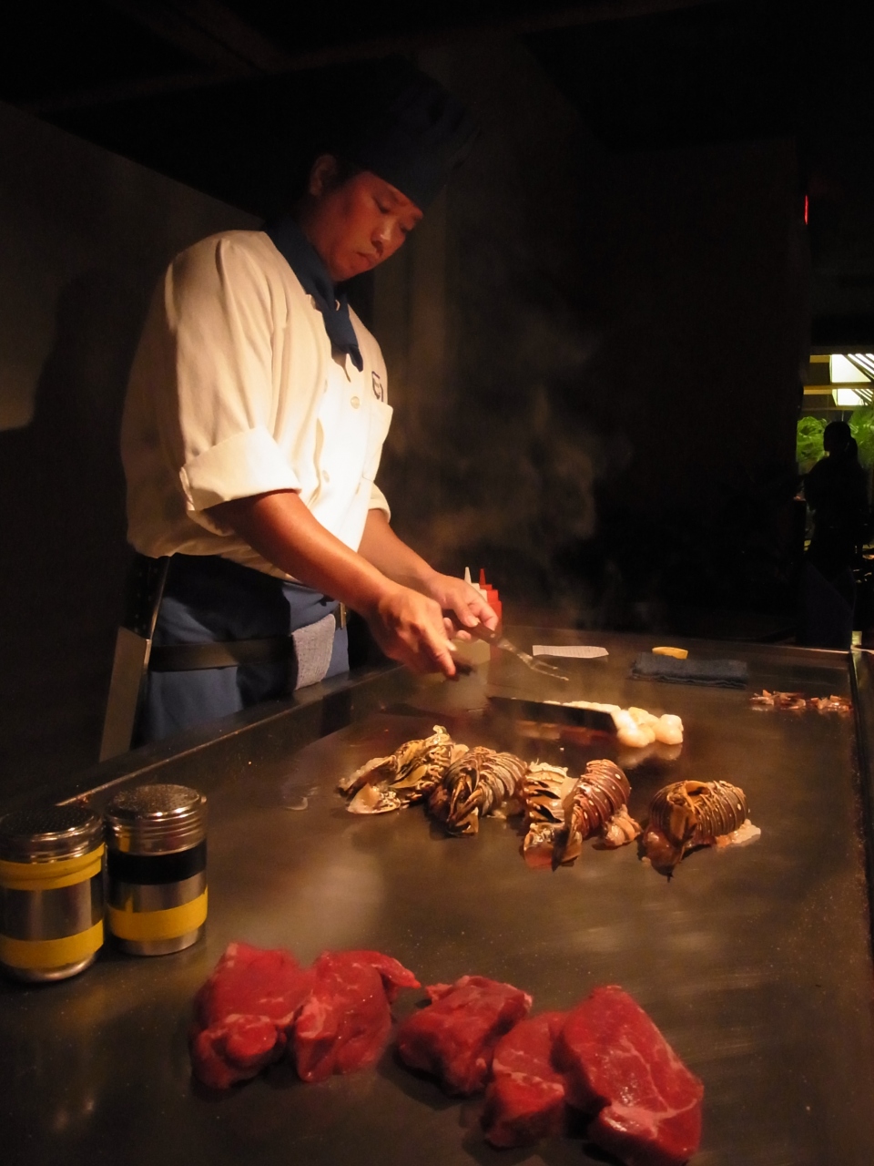 田中オブ東京は評価の分かれるお店だろうと思います。定番メニューの将軍は確か$60でフィレステーキ・ロブスター・貝柱ですが、その下の大名 $50はお肉とロブスターのランクが下がる程度。正直素人にランクなど分かりません。少なくとも我が家は分かりません。が男性が将軍、女性は大名などとしても面倒なので人数分将軍です。お肉も美味しいしロブスターだって美味しいです。日本で食べたら諭吉さんが飛んでいきます。上質の料理と静かに食べるのもアリですがパフォーマンスを見ながら笑いながら食べるのもよいですよ。お酒の種類も多いです。高いですが。それでも我が家は必ず訪れます。美味しいし楽しいから♪ 今年は大人5人と子供1人、将軍5人前を頼んで、ビールを5本、赤ワインを1本、グラスワインを数杯頼んでチップ入れて $500しなかったかな。飲みすぎなので高いですが(爆)