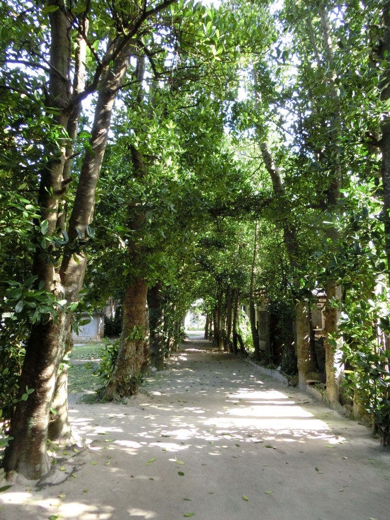舗装されていない白い砂地の道の両サイドにフクギが立ち並び、やさしい木漏れ日が差し込む穏やかな空間は、そこだけぽっかりと別世界への入り口みたいです。
