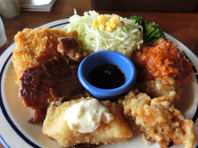 チキンカツ・薄いステーキ・フィッシュフライ・から揚げ・ミートソースパスタとキャベツがのっています。